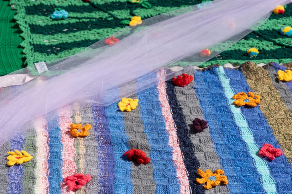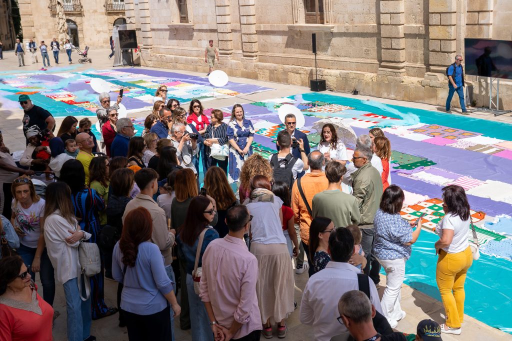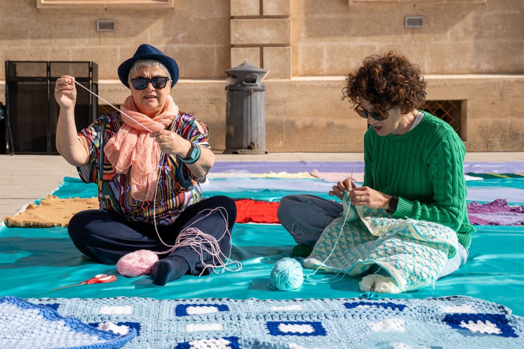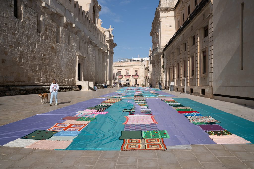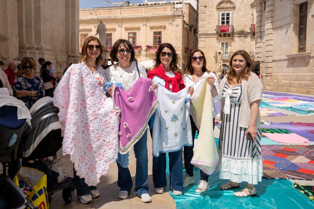 Il momento centrale è stato l’allestimento di un’installazione di Land Art con le copertine realizzate nei laboratori di Lanaterapia. Pezzi unici, lavorati da mani diverse – pazienti, familiari, caregiver – nei reparti dell’Ospedale Cannizzaro di Catania e in molte altre comunità italiane, dalla Valsugana a Nicosia. Un gesto concreto di cura che ha prima trasformato piazza Minerva a Ortigia in una grande distesa colorata e poi sono diventate dono per i bambini del territorio e per alcuni minori non accompagnati. Emozionante la consegna con anche il coinvolgimento della Biblioteca di Belvedere.